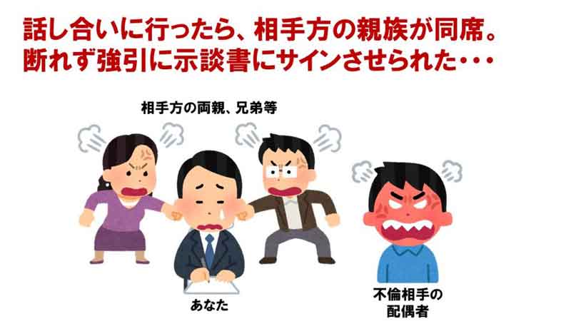 ・相手方の親族・友人が多数同席し、威圧される
